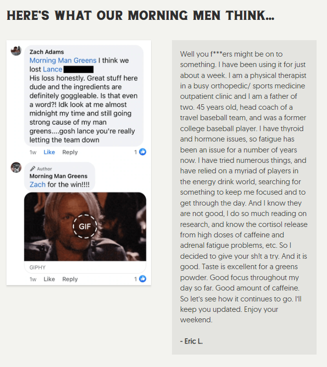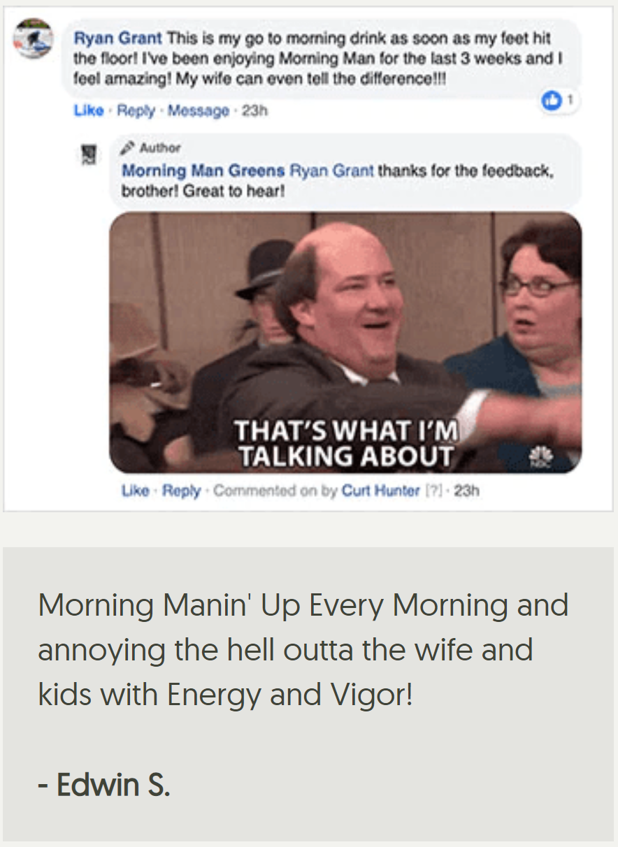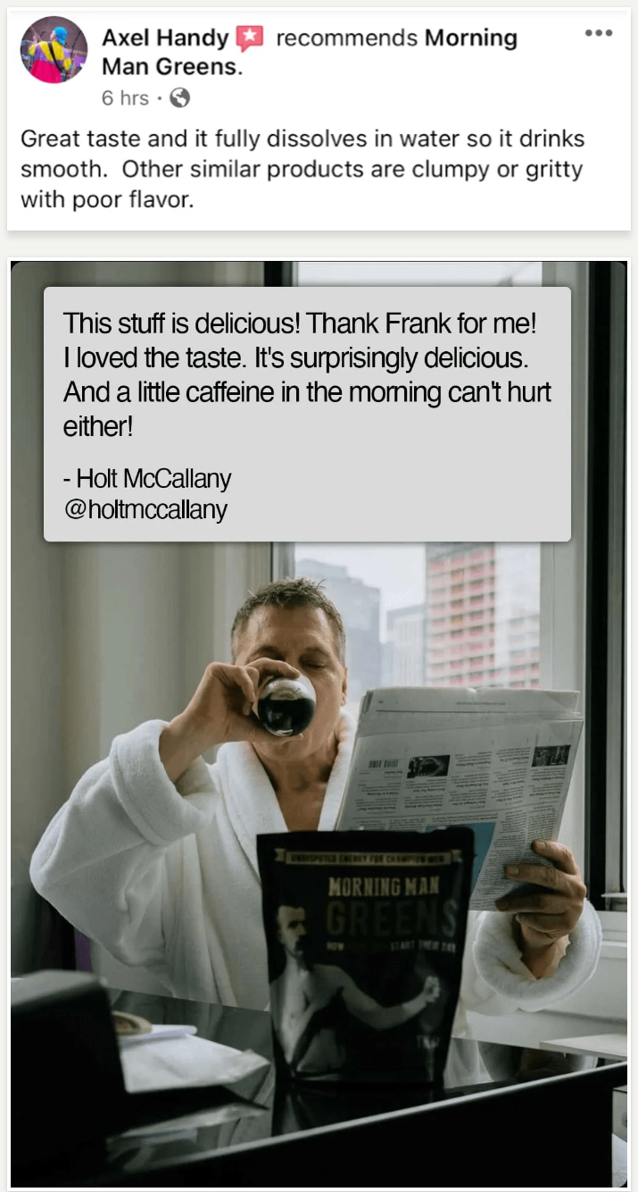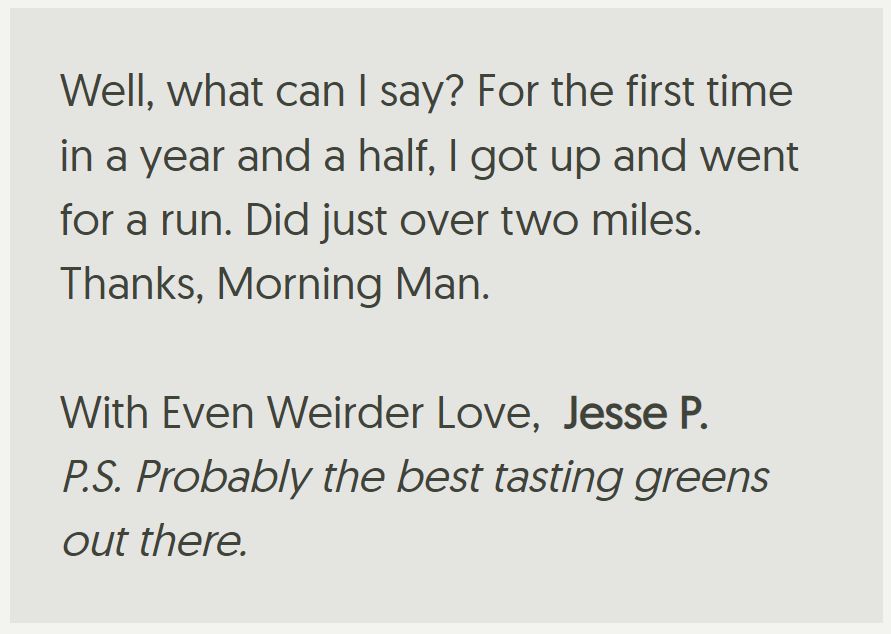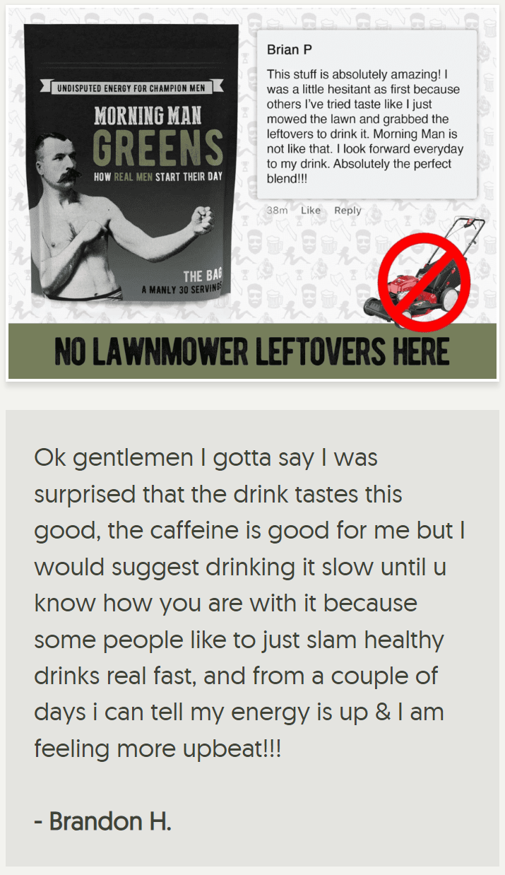 YOU: "If I'm going to do something, I better effin' do it right. There are cheaper greens powders out there but only Morning Man Greens will help me live my life like the brutish bastard I was built to be."