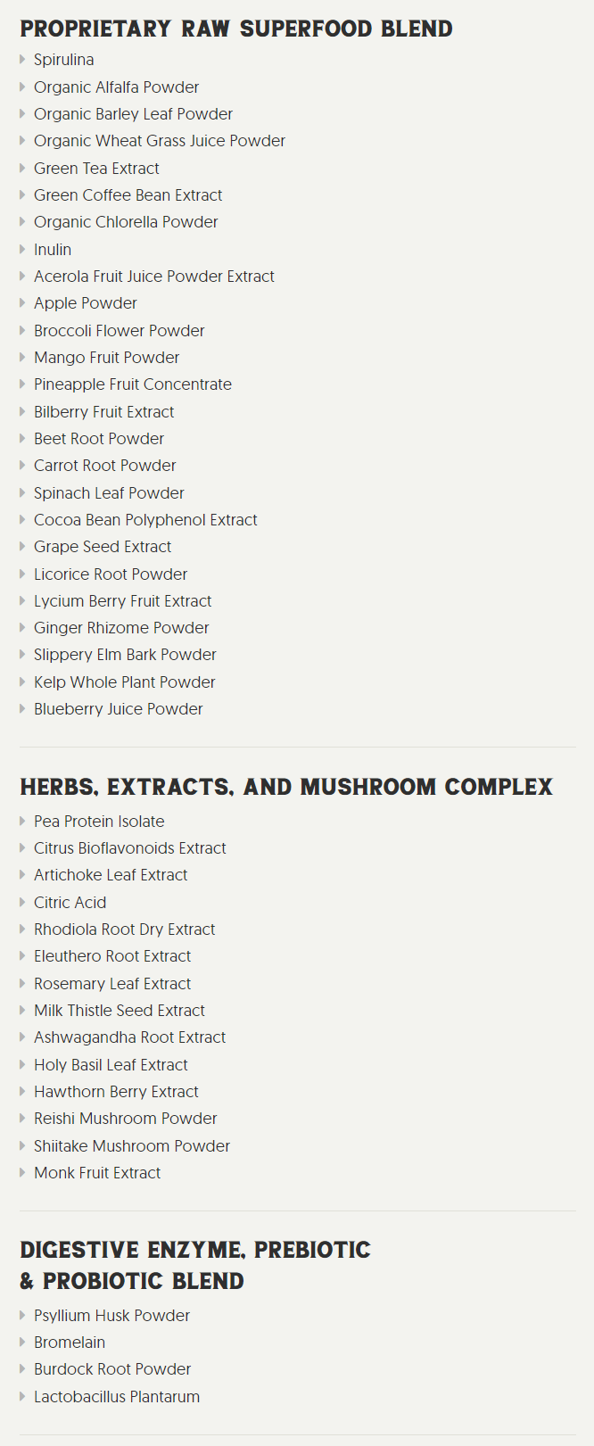 ...So don't let the fancy marketing fool ya, this product is truly good for you! Prepare yourself the 43 raw superfood ingredients below will rock your world.