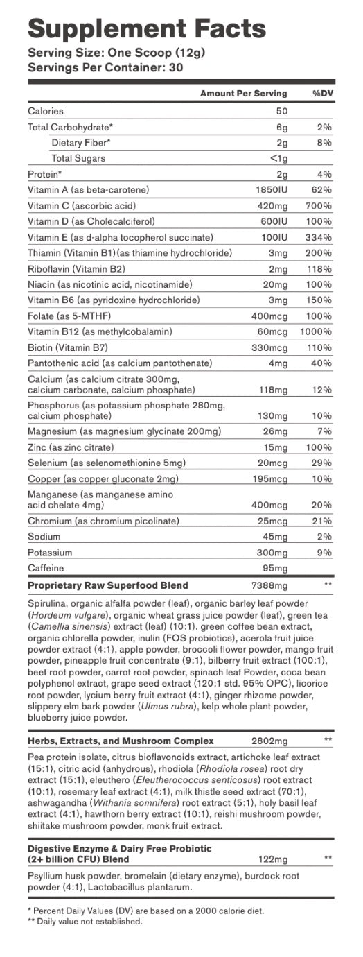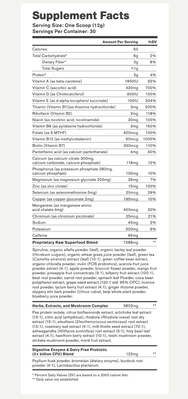 Our proprietary Superfood blend of" caffeine injected greens" contains powerful natural probiotics, herbs, and extracts. It's non-GMO without any fillers, artificial sweeteners, additives, artificial flavors, preservatives, colors, yeast, soy, added sodium, or starch.