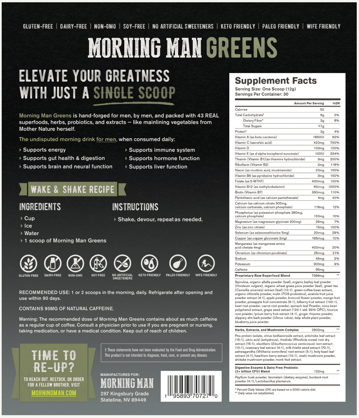 (Morning Man Greens is good for everyone who wants to make each day their bitch. Just BEWARE: if you open that door, your wife will steal this from you. Although our proprietary blend contains good-for-you greens, it does contain 95 mg of caffeine so we recommend you DO NOT share this with children or anyone pregnant.)